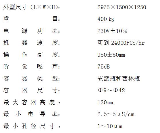 ![]() HAD玻璃安瓿電子微孔檢漏機(jī)主要應(yīng)用于1ml.2ml.5ml.10ml玻璃安瓿小水針的檢漏。 用對(duì)灌封后的瓶子施加高頻高壓的方法進(jìn)行電導(dǎo)性探測(cè),對(duì)瓶身上的細(xì)微針孔,裂縫,瓶壁厚薄等作最嚴(yán)密的檢查。本機(jī)既可單機(jī)使用也可以自動(dòng)在線使用。 玻璃安瓿微孔檢漏機(jī)主要技術(shù)指標(biāo) ![]() |